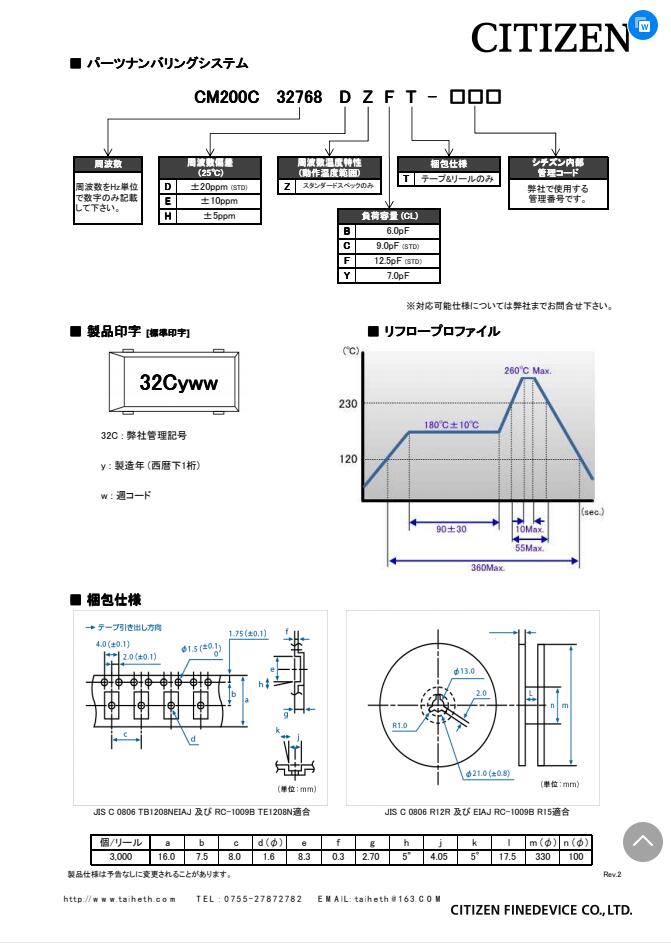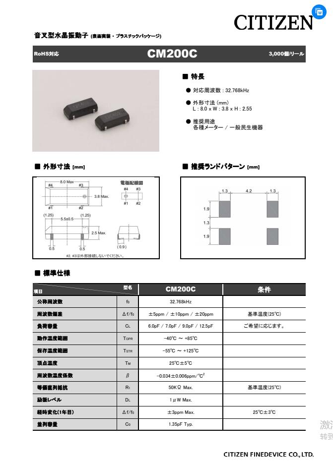 | CM200C32768AZFT | CITIZEN晶體 | 32.768kHz | ±30ppm | 12.5pF | 50 kOhm | -40°C ~ 85°C |