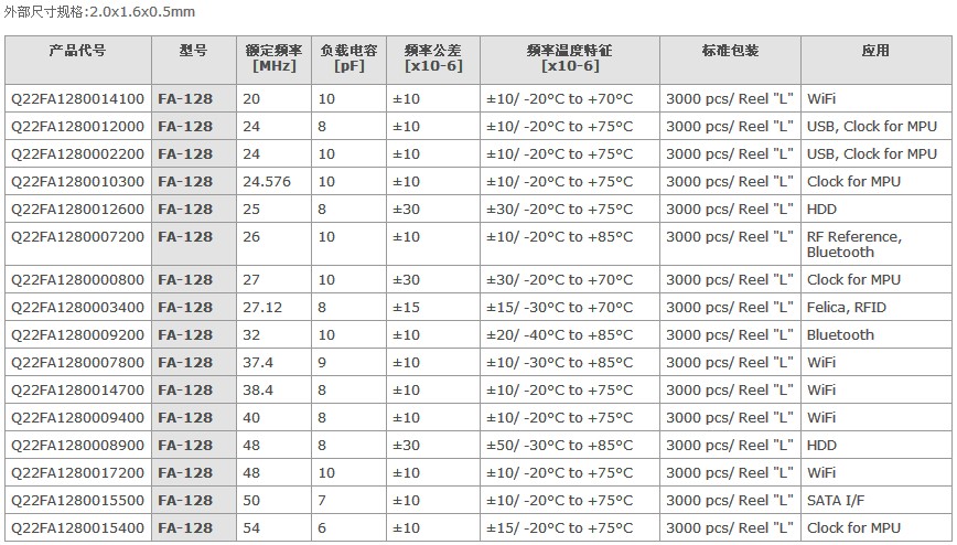 愛普生晶振型號FA-128,2016晶振型號產(chǎn)品代碼一覽表