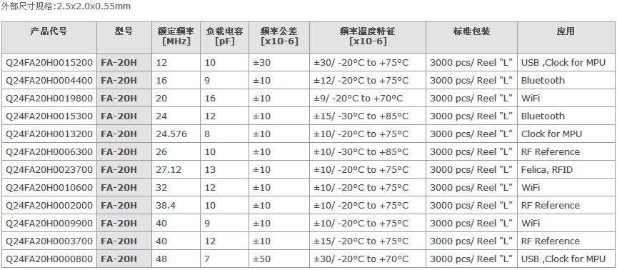 愛普生晶振FA-20H,2520晶振代碼一覽表