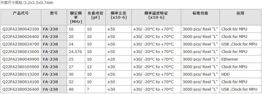 愛普生晶振,FA-238系列產(chǎn)品代碼一覽表