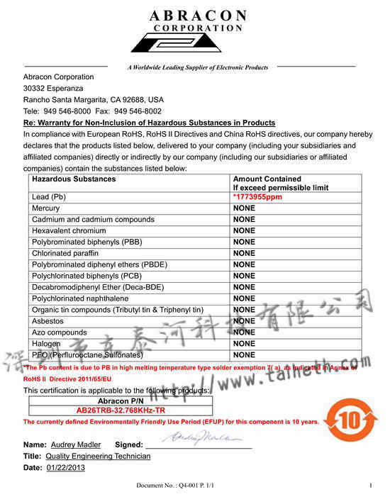 以下資料是AB26TRB晶振的歐盟ROHS相關證明書。