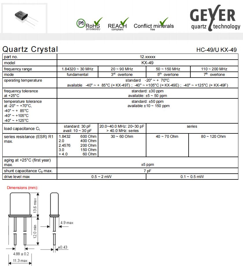 12.81040|12MHz|30pF|丹麥格耶晶振,丹麥格耶晶振,KX-49T石英晶體,無源晶振,12.81040晶振,HC-49U插件晶振,晶體諧振器,二腳封裝晶振,11.3*4.9*13.6mm晶振,頻率12MHz,負載30pF,頻率容差30ppm,工作溫度-40~85°C,高品質晶振,高穩定性晶振,無鉛環保晶振,無線路由器晶振,智能家居晶振,家用電器遙控器晶振,監控攝像頭晶振.
