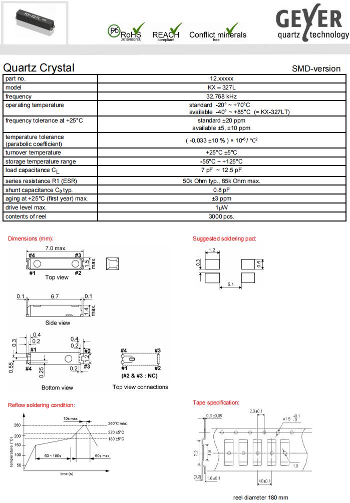 12.87132|32.768KHz|7.0pF|格耶SMD音叉晶體,Geyer晶振,KX-327L音叉晶體,無源晶振,12.87132晶振,7015mm晶振,石英晶體諧振器,SMD晶振,四腳貼片晶振,頻率32.768KHz,負載7.0pF,頻率容差20ppm,工作溫度-20~70°C,高可靠性晶振,低老化晶振,耐環境特性晶振,時鐘鐘表晶振,兒童學習產品晶振,智能體溫計晶振,家用電器晶振.