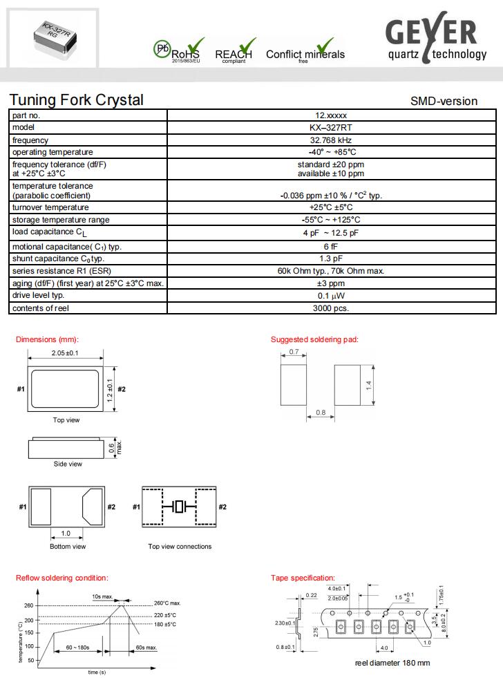 12.87160|32.768KHz|12.5pF|格耶石英晶振,歐美進口晶振,格耶晶振,KX-327RT石英晶振,12.87160晶振,無源晶振,石英晶體諧振器,貼片晶振,SMD晶振,2012mm晶振,頻率32.768KHz,負載12.5pF,頻率容差20ppm,工作溫度-40~85°C,超小型晶振,高可靠性晶振,無鉛環保晶振,可穿戴設備晶振,物聯網晶振,通訊設備晶振,音頻系統晶振.