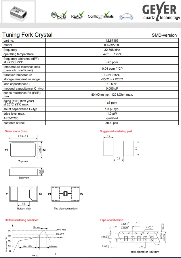 12.87166|32.768KHz|12.5pF|格耶車(chē)規(guī)級(jí)晶振,格耶晶振,KX-327RF車(chē)規(guī)級(jí)晶振,無(wú)源晶振,12.87166晶振,2012mm晶振,石英晶體諧振器,二腳貼片晶振,SMD晶振,頻率32.768KHz,負(fù)載12.5pF,頻率容差20ppm,工作溫度-40~125°C,耐高溫晶振,高穩(wěn)定性晶振,無(wú)鉛環(huán)保晶振,汽車(chē)音響控制器晶振,環(huán)繞視圖攝像頭晶振,GPS導(dǎo)航晶振,信息娛樂(lè)系統(tǒng)晶振.