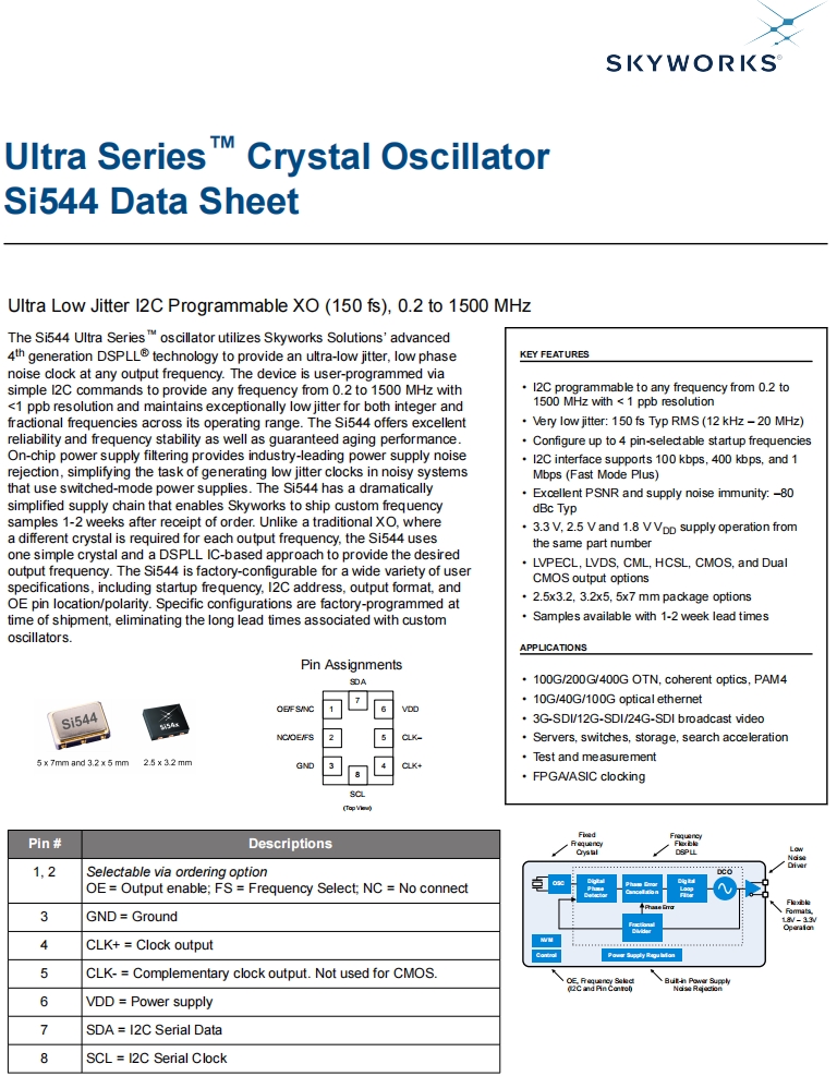 | 544BCAB000126CCG | Skyworks Solutions Inc. | Ultra™ Si544 | 20 MHz | LVDS | 1.8V, 2.5V, 3.3V |