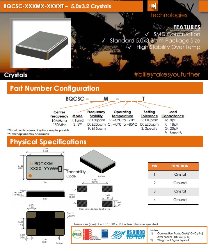 進口高品質Bliley晶振,BQCSC-38.400M3-FCBFT環保晶振,6G信號放大器晶振,美國Bliley晶振公司,高品質晶振6G發射器晶振,6G通訊設備晶振,高精度儀器晶振,6G以太網晶振,無源晶振,SMD封裝,標準5X3.2mm包裝尺寸,高溫下高穩定性,進口晶振,百利晶振,高品質晶振,BQCSC-38.400M3-FCBFT晶振,5032晶振,四腳晶振,貼片晶振,石英晶振