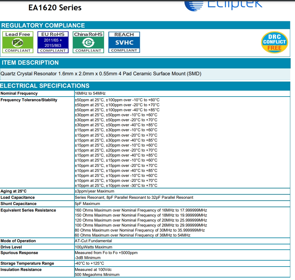 | EA1620JA12-20.000M | 表面貼裝晶體諧振器 | Crystal Resonator 20MHz ±15ppm (Tol) ±30ppm (Stability) 12pF FUND 120Ohm 4-Pin CSMD Bulk | -40~85 |