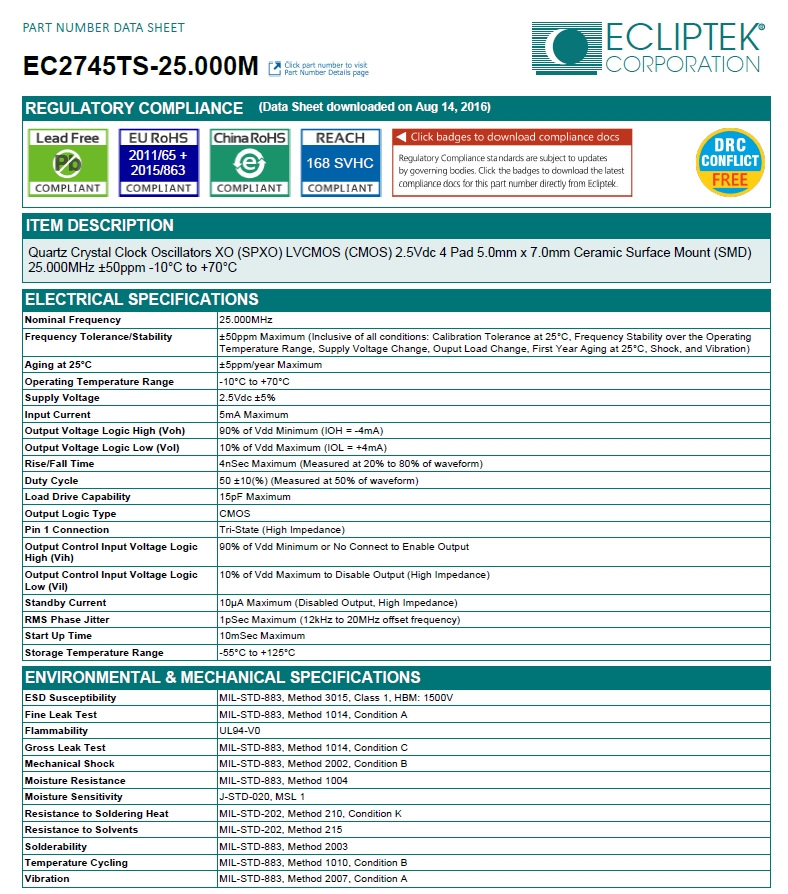 EC2745TS-25.000M|25MHZ|ECLIPTEK晶振,物料編碼EC22745TS-25.000M,頻率25MHZ,精度±50ppm,負載電容15PF, 輸出LVCMOS 60%,尺寸: 4-Pin CSMD Bulk,溫度范圍:-10℃-70℃,電壓2.5V,SMD晶體,有源晶振,SPXO晶振,ECLIPTEK晶振,差分晶振,歐美晶振,晶振,石英晶體振蕩器,特點:輕型,薄型,小型,低抖動,低功耗,低差損,應用于X光,磁共振,智能溫度計,智能體重秤,錄音筆,微型攝像頭.