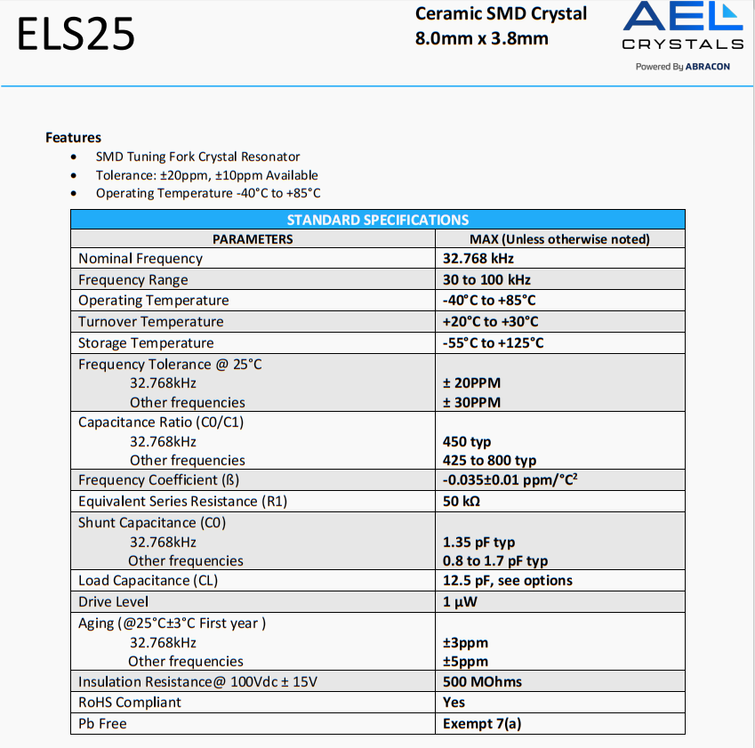 ELS25-32.768kHz-6-2-T|ELS25|32.768KHz|AEL Crystal,美國AEL晶振公司,ELS25晶振,ELS25-32.768kHz-6-2-T晶振,8038晶振音叉晶振,貼片晶振,四腳晶振,陶瓷晶振,高精度晶振,進口晶振,歐美晶振,低抖動晶振,石英晶振,超小型晶振,歐美晶振,音叉晶振,特點:SMD音叉晶體諧振器,公差:±20ppm,±10ppm可用,工作溫度-40°C至+85°C, -40°C至+125°C和-55°C至+125°C可用,符合RoHS標準(無鉛),低外形通孔封裝,at切割晶體,優異的老化,非常緊密的溫度穩定性,行業標準引線間距。