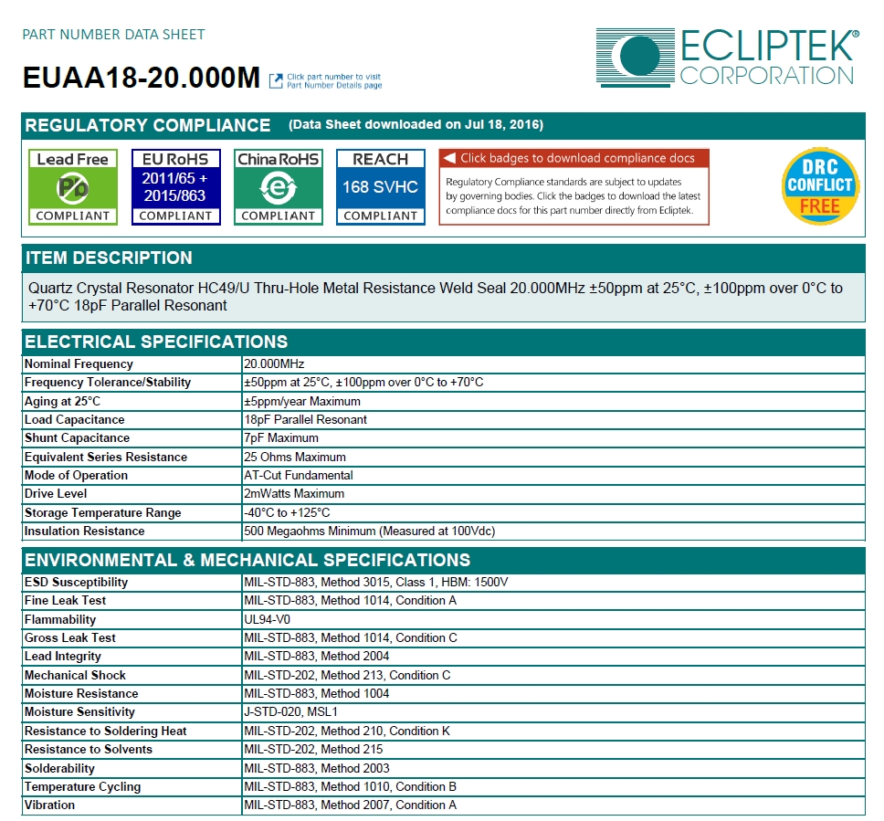 EUAA18-20.000M|石英晶體諧振器|兩腳插件晶振,物料編碼EUAA18-20.000M,頻率20MHZ,精度±50ppm,負載電容18PF, 尺寸: 2-Pin HC-49/U,溫度范圍:0℃-70℃,,兩腳插件晶振,無源晶振,石英晶振,ECLIPTEK晶振,歐美晶振,晶振,石英晶體諧振器,特點:輕型,薄型,小型,應用于mp3,mp4,mp5,DVD,U盤,USB轉接,網卡.