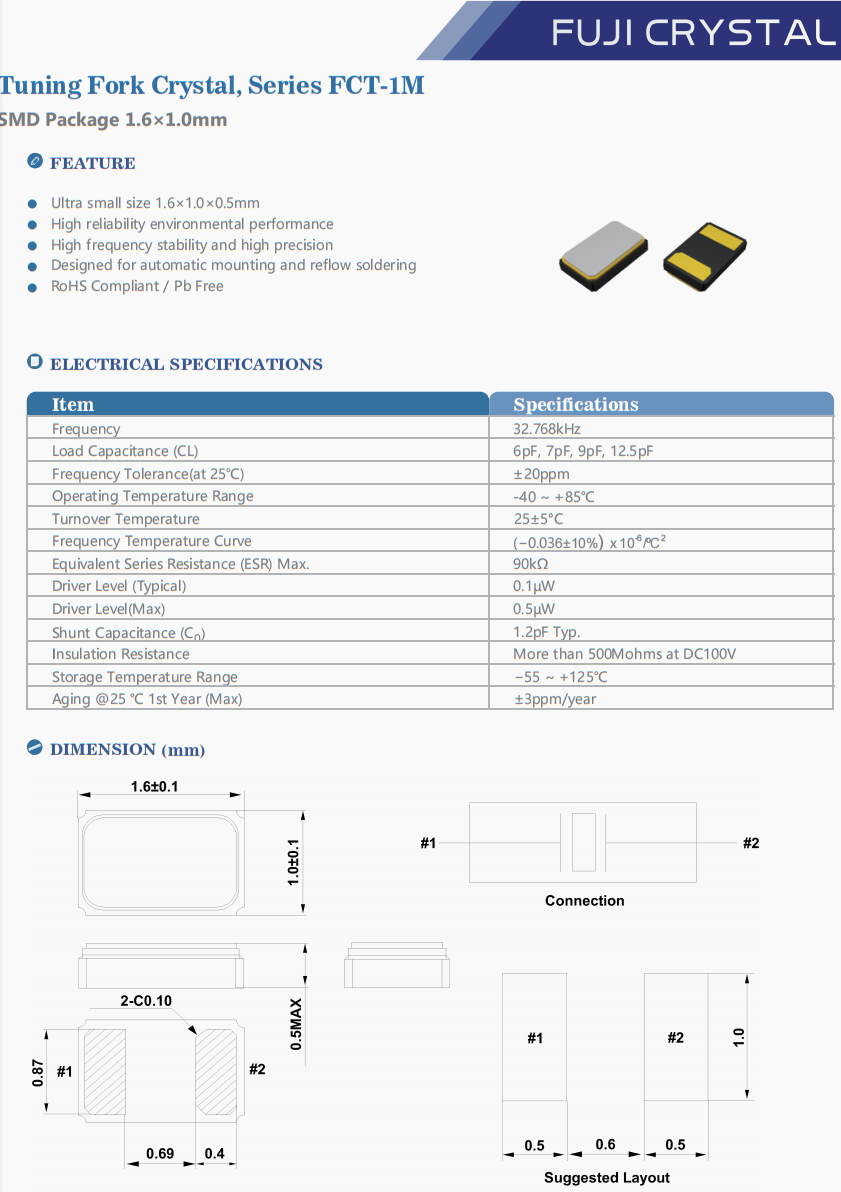 | FCT1M032768C5E1 | Fuji晶振 | FCT-1M | 32.768 kHz | - | - | 12.5pF | -20°C ~ 70°C |