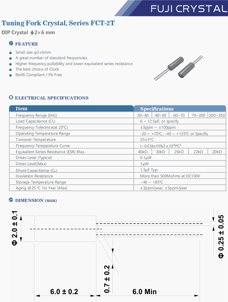 日本富士晶振,FCT2T03276809P3圓柱晶振,領先全球的6G路由器晶振,日本富士晶振,F(xiàn)uji晶振,6G通訊終端晶振,高精度晶振,圓柱晶振,2*6晶振,石英晶振,二腳晶振,無源晶振,KHz晶振,插件晶振,6G通訊專用晶振,6G路由i去晶振,高品質(zhì)晶振,F(xiàn)CT-2T晶振,小尺寸φ2×6mm,大量的標準頻率,更高的頻率可拉性和更低的等效串聯(lián)電阻,鐘表的最佳選擇,符合RoHS標準/無鉛