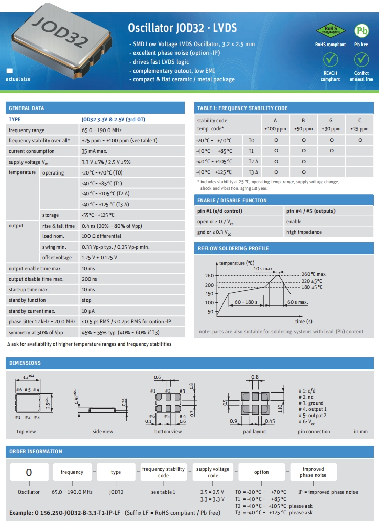 JAUCH晶振,O156.250-JOD32-B-3.3-T2-LF,6G信號接收器晶振規(guī)格表