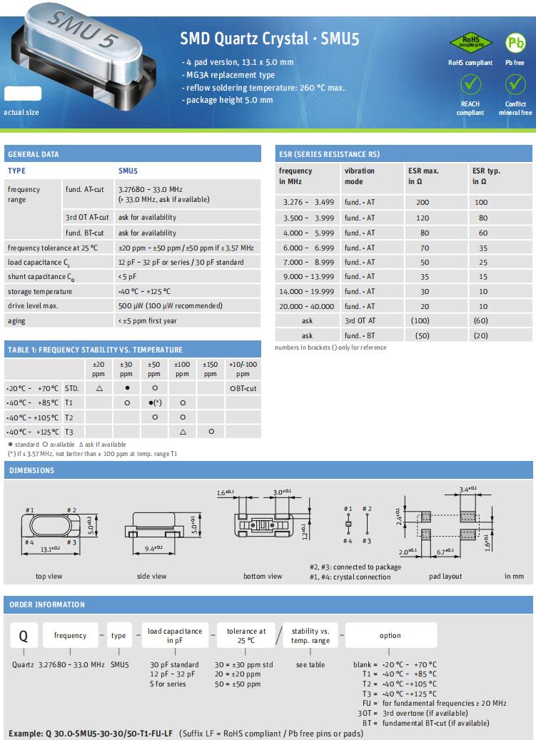 Jauch Crystal|Q 14.74560-SMU5-30-30/50-T2-LF,歐美進口晶振,Jauch晶振,SMU5石英晶振,Q 14.74560-SMU5-30-30/50-T2-LF晶振,無源晶振,進口貼片晶振,晶體諧振器,四腳晶振,頻率14.7456MHz,負載30pF,頻率穩定性50ppm,工作溫度-40~105°C,高性能晶振,高精度晶振,抗震動晶振,測試與測量設備晶振,調制解調器晶振,服務器和存儲系統晶振.