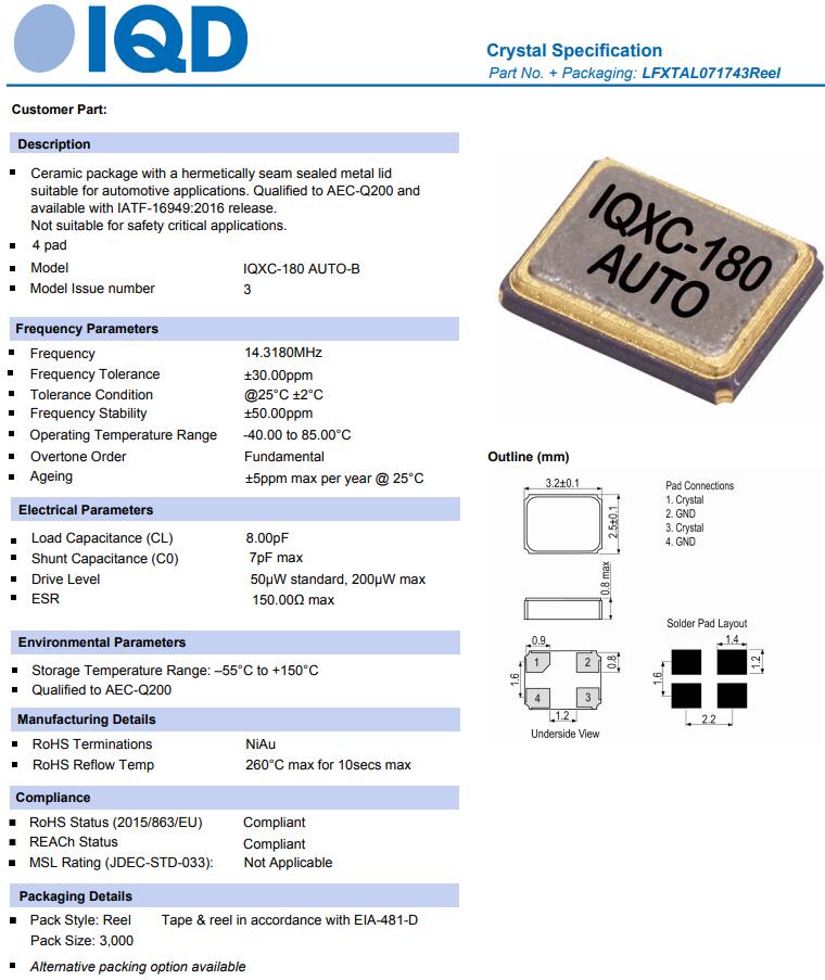 LFXTAL071743REEL|Resonator Crystal,IQD晶振,IQXC-180AUTO無源晶振,LFXTAL071743REEL晶振,石英晶體諧振器,四腳貼片晶振,進口晶振,3225貼片晶振,頻率14.318MHz,負載8pF,頻率容差30ppm,工作溫度-40~85°C,高穩定性晶振,輕薄小晶振,耐高溫晶振,醫療電子設備晶振,全球衛星導航晶振,遠程信息處理晶振,汽車動力系統晶振.