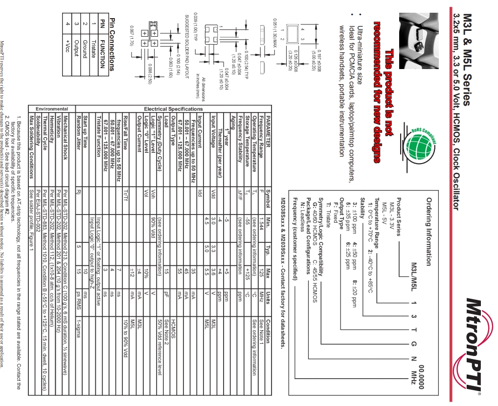 • 產品應用: MTRONPTI晶振,型號M3L,M5L,編碼M3L26TCN100.000000,精度25PPM,頻率100MHZ,電壓3.3V,輸出HCMOS,尺寸5032mm。石英振蕩器,有源晶振,5032晶振,SPXO貼片晶振