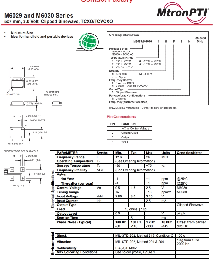 | M6029S060 25.000000 | M6029 and M6030 | ±2 ppm | 25 | 5.0 x 7.0 mm | -40°C to +85°C | 3.3 |