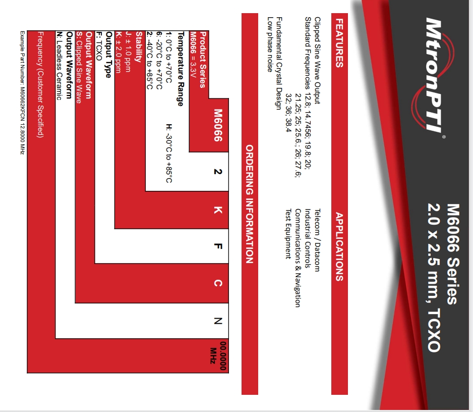 M6066S002 38.400000|M6066|MTRONPTI晶振 ,MTRONPTI晶振, 型號M6066 ,編碼M6066S002 38.400000,精度±0.5PPM,頻率38.4MHZ,電壓3.3V,輸出Clipped Sinewave,尺寸2520mm,石英晶體振蕩器,石英晶振,有源晶體振蕩器,TCXO晶振,有源晶振,工作溫度范圍:-30°C-85°C,六腳貼片晶振,特點:輕型,薄型,小型,低電源電壓,低功耗,低差損,可以廣泛應用在醫療設備中智能體溫計,X光,磁共振,CT機,智能體重計,智能測壓機,心電圖,肌電圖.