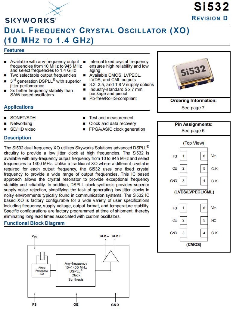 | 531BB125M000DGR | Skyworks Solutions Inc. | Si531 | 125 MHz | LVDS | 3.3V |