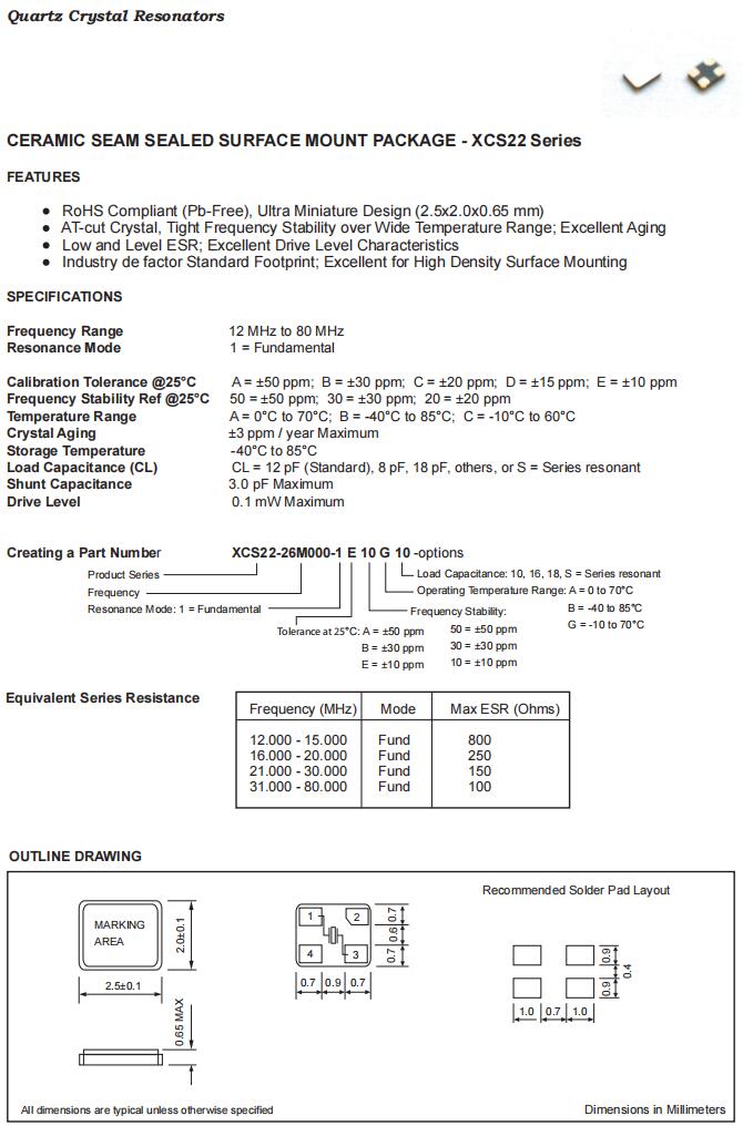XCS22-26M000-1E10B18|26MHz|18pF|Fortiming Crystal,Fortiming晶振,XCS22進(jìn)口晶振,無源晶振,XCS22-26M000-1E10B18晶振,貼片晶振,石英晶體諧振器,2520mm晶振,SMD晶體,四腳封裝晶振,頻率26MHz,負(fù)載18pF,頻率容差10ppm,工作溫度-40~85°C,無鉛環(huán)保晶振,超小型晶振,高精度晶振,藍(lán)牙模塊晶振,移動(dòng)應(yīng)用晶振,超薄設(shè)備物聯(lián)網(wǎng)晶振,無線通信晶振.
