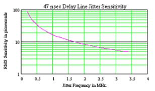 d),靈敏度下降約2??0 dB / decade。對于圖3中所示的47nsec延遲,轉角頻率出現在3.3MHz。使用CSA-803可以將3.3 MHz以上頻率引起的所有抖動分解為大約5 ps。330 kHz時的抖動無法在50 ps以下解析。以類似的方式,在500 ps以下無法測量33 kHz的抖動。圖4是使用47納秒延遲線的RMS抖動靈敏度圖。了解此測量方法的優點和局限性至關重要。對于給出的數值示例,將不會看到低于300 kHz的低頻抖動。相反,可以很容易地識別由邊帶3.0 MHz偏移或更多引起的抖動。當測量采用直接倍頻的振蕩器或不考慮低頻抖動時,該測試方法是合適的。(參見模式抖動的先前描述)。
