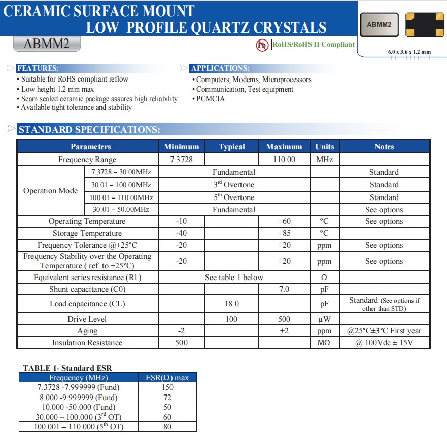 | ABMM2-10.000MHZ-E2-T | Abracon晶振 | ABMM2 | MHz Crystal | 10MHz | 4-SMD, No Lead |