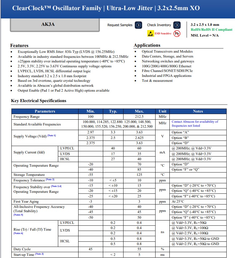 超低抖動clear clock SMD振蕩器AK3ADAQ1-120.000T3,AK3A振蕩器小體積晶振尺寸3.2x2.5mm的行業(yè)標(biāo)準(zhǔn)尺寸,有源晶振,提供節(jié)省空間的設(shè)計,與以前的型號相比,抖動性能大幅提高。這些振蕩器還支持各種差分輸出,因此可以輕松集成到各種系統(tǒng)中。第三泛音ClearClock技術(shù)減少了基于鎖相環(huán)(PLL)的乘法運(yùn)算,消除了降低整體功耗的可能性。使這些新的ClearClock振蕩器非常適合光收發(fā)器、數(shù)據(jù)中心、存儲和服務(wù)器、網(wǎng)絡(luò)交換機(jī)和網(wǎng)關(guān)、100G/200G/400G/800G以太網(wǎng)、光纖通道和PCIe終端應(yīng)用。