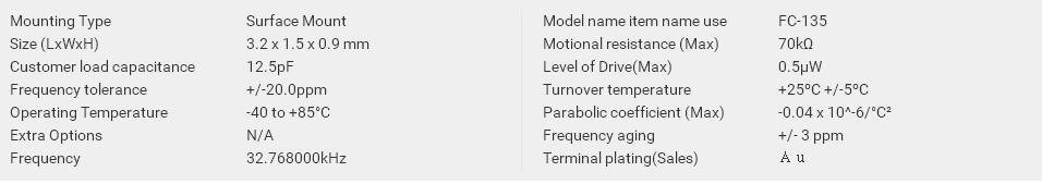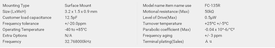 | 3.2 x 1.5 x 0.9 mm | FC-135 | Q13FC1350000300 | 32.768000 kHz | -40 to +85 °C | ≤ 70 KΩ |