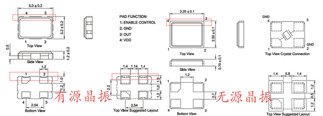 查看大圖可以清楚的看到做出標(biāo)記的地方是有些區(qū)別的,先看正面,左圖有明顯的凹凸不平,而右圖卻一馬平川,再看下面的腳位圖也是如此.則可以得出這么一個(gè)結(jié)論,有源晶振的外觀是有"缺陷"的(凹凸不平的),無(wú)源晶振則是一條線,概括一句話就是直.