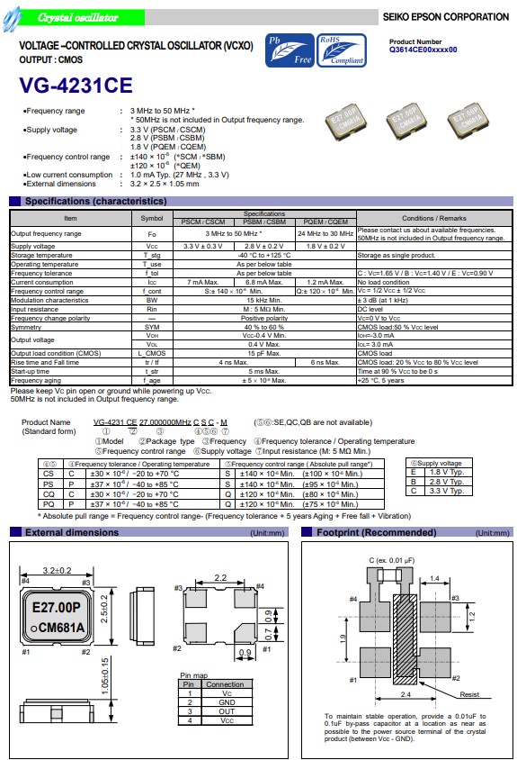 VG-4231CE具有CMOS輸出壓控晶體振蕩器,Q3614CE00001300,低電源電壓晶振
