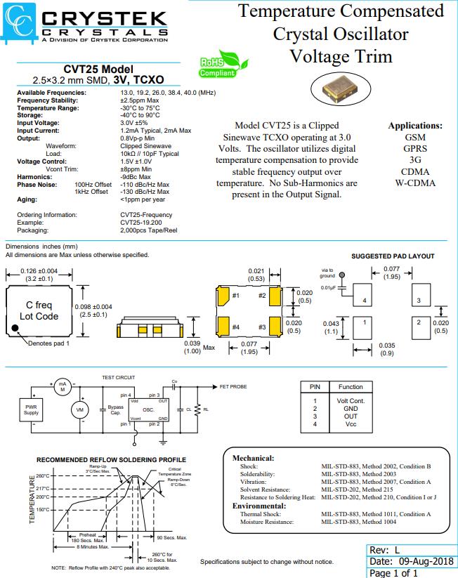 | CVT25-38.400 | CRYSTEK振蕩器 | CVT25 | Active | TCXO | 38.4MHz | ±2.5ppm | -30°C ~ 75°C |