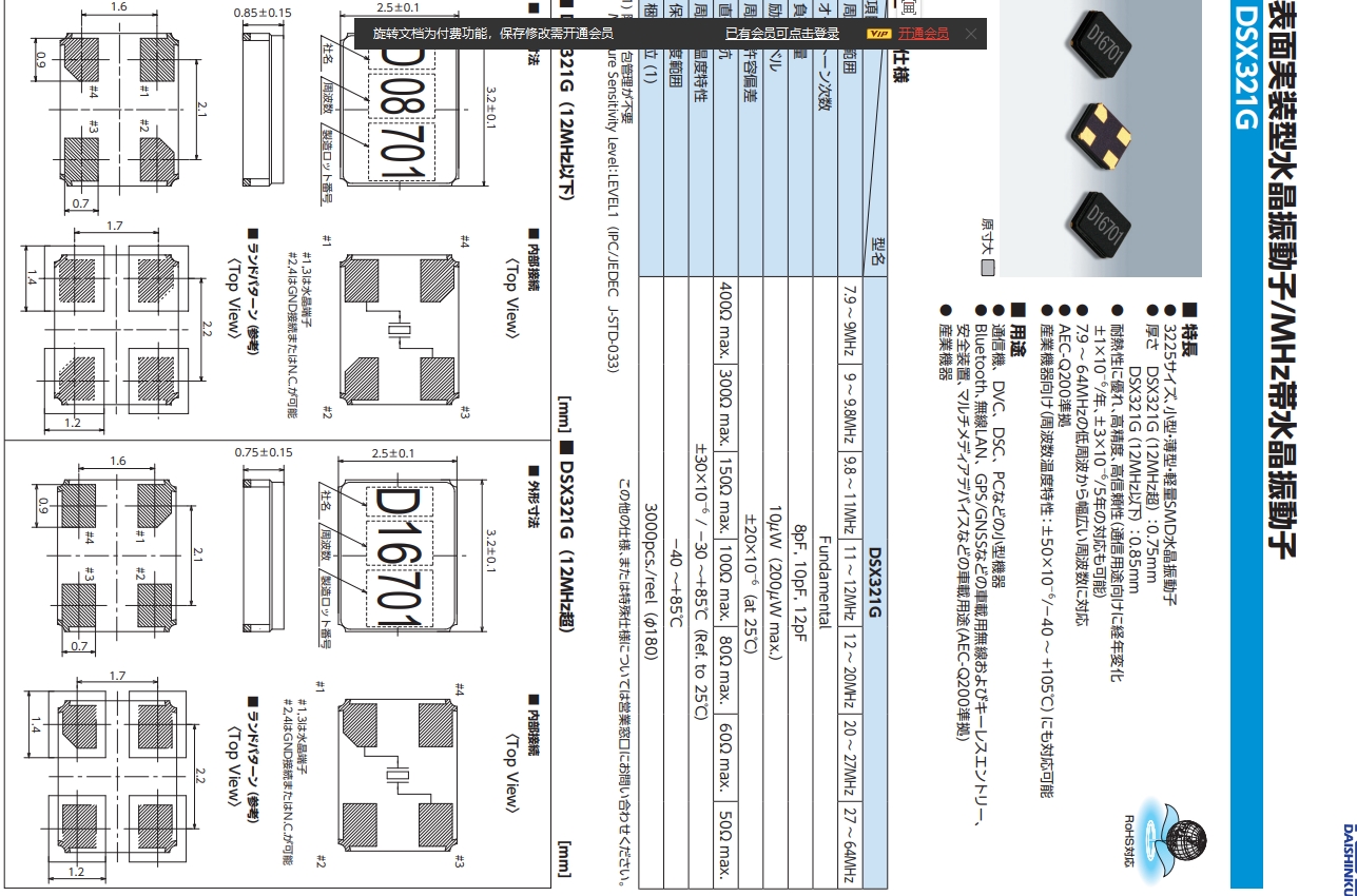| KDS晶振 | 7AD01200A1R | DSX321G | 3225 | 12.000MHZ | ||