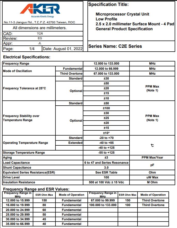 AKER品牌|C2E-32.000-18-2030-X-R|2520mm,AKER晶振,C2E進口晶振,無源晶振,C2E-32.000-18-2030-X-R晶振,石英晶體諧振器,SMD晶體,2520mm晶振,四腳貼片晶振,頻率32MHz,負載18pF,頻率容差20ppm,工作溫度-40~85°C,高可靠性晶振,小體積晶振,低老化晶振,便攜式電子設備晶振,低姿態應用晶振,無線網絡晶振,移動應用晶振.