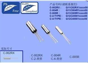 • "C-004R 32.7680K-A:PBFREE"晶體產品可能會在某些條件下受到損壞。例如從桌上跌落或在貼裝過程中受到沖擊。如果產品已受過沖擊請勿使用。