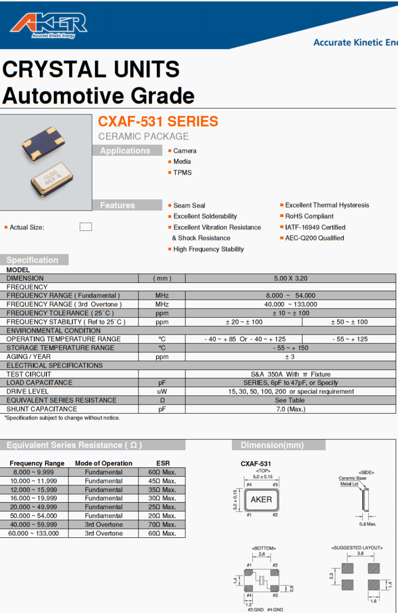 臺產6G信號放大器晶振,CXAF−531 32MHz無源晶振,臺灣AKER晶振公司,CXAF−531晶振,高品質晶振,5032晶振,6G信號放大器晶振,6G無線網晶振,小尺寸晶振,日本進口晶振,6G通訊設備晶振,6G路由器晶振,四腳晶振,石英晶振,貼片晶振,無源晶振,接縫密封,優(yōu)異的熱滯性,優(yōu)良的可焊性,通過無鉛認證,實際尺寸,優(yōu)異的抗振性,IATF−16949認證,耐沖擊,AEC−Q200合格,高頻穩(wěn)定性