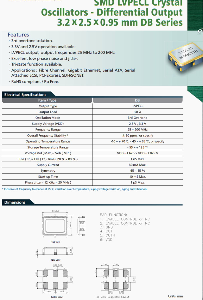 TXC晶振,DB差分LVPECL晶振,DBA5600005六腳晶振,臺灣TXC晶振公司,晶技晶振,石英晶振,貼片晶振,有源晶振,差分晶振,LVPECL晶振,高精度晶振,高端產品晶振,環保無鉛晶振,六腳晶振,第三次泛音解決方案,3.3 v和2.5V可選。LVPECL輸出,輸出頻率25mhz ~ 200mhz。出色的低相位噪聲和抖動。三態功能。應用:光纖通道,千兆以太網,串行ATA,串行,附加SCSI, PCI-Express, SDH/SONET。符合RoHS標準/無鉛。