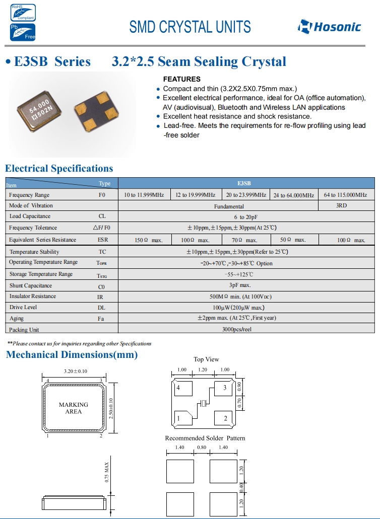 | E3SB14.0000F18E22 | Hosonic晶振 | E3SB | 14 MHz | 18 pF | ±20 ppm | ±20 ppm |
