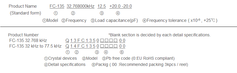 • "FC-135 32.7680KA-A5",晶體產品可能會在某些條件下受到損壞。例如從桌上跌落或在貼裝過程中受到沖擊。如果產品已受過沖擊請勿使用。