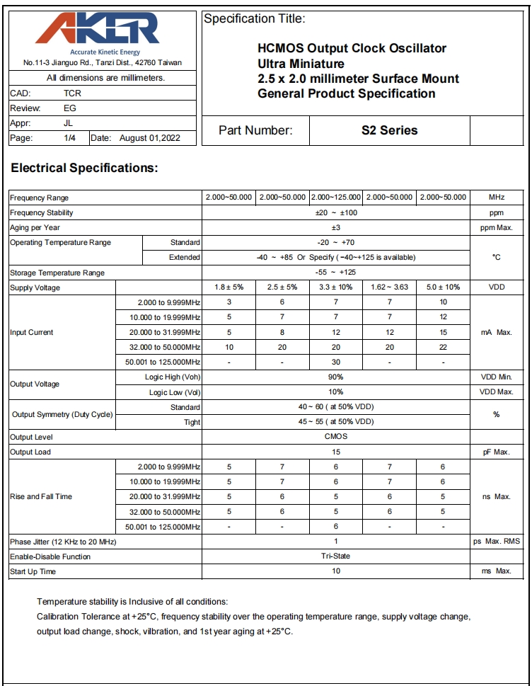 S233025T-48.000-X-R|48MHz|3.3V|AKER進口晶振規格表