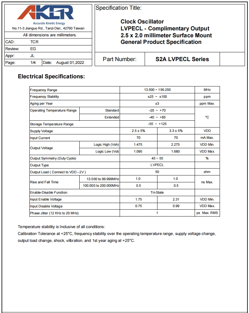 S2A2505-156.250-P-X-R|156.25MHz|2.5V|臺灣AKER晶振規格表