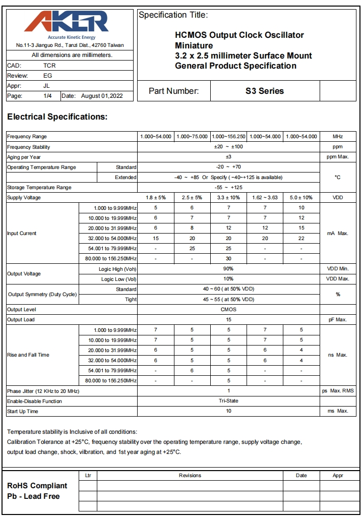 S32503T-36.000-X-R|36MHz|2.5V|臺灣AKER晶振規格表