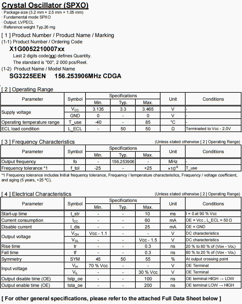| SG7050EBN 106.250000M-CJGA3 | EPSON | SG7050EBN | 106.25 MHz | LVPECL | 3.3V |