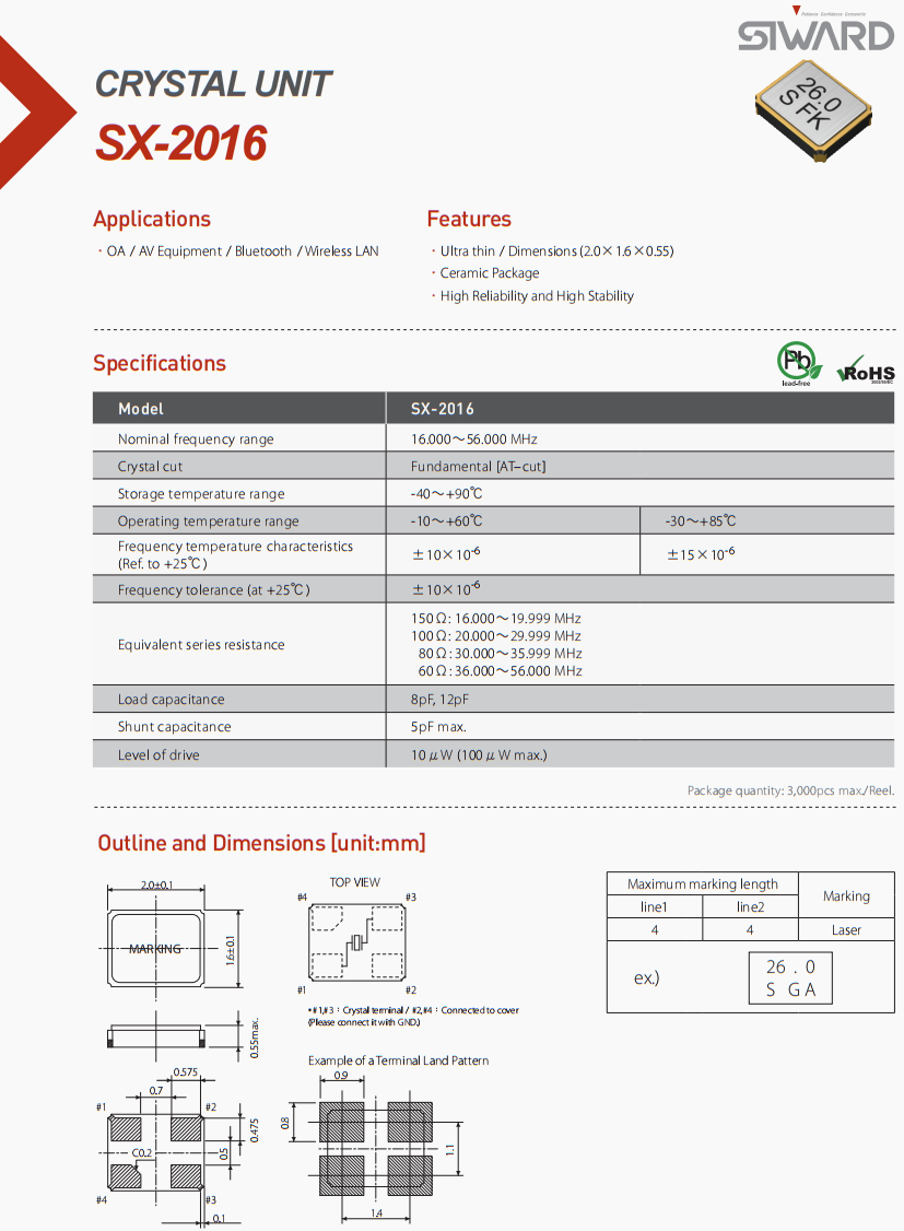 | XTL501300-A292-004 | Siward晶振 | SX-2016 | 16 MHz | ±20ppm | 9pF | -40°C ~ 85°C |