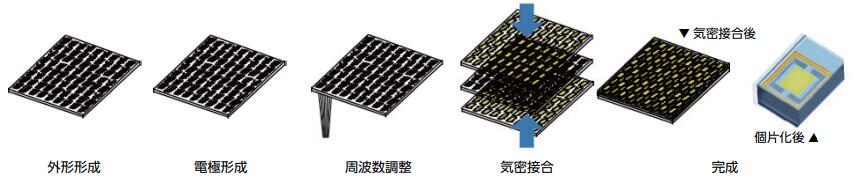 通過使用晶片級封裝,其中具有諸如通過光刻工藝形成的振動部分的外形的三個石英晶片被接合和單個化,可以在不使用導電粘合劑的情況下減小保持部分和振動部分的厚度。它實現了整體結構。這解決了伴隨傳統結構中產品的小型化并確保諸如石英晶振元件的安裝位置的余量的提高導電粘合劑的涂覆精度的問題。另外,通過在真空中進行晶片清潔和粘合,可以降低質量風險。
