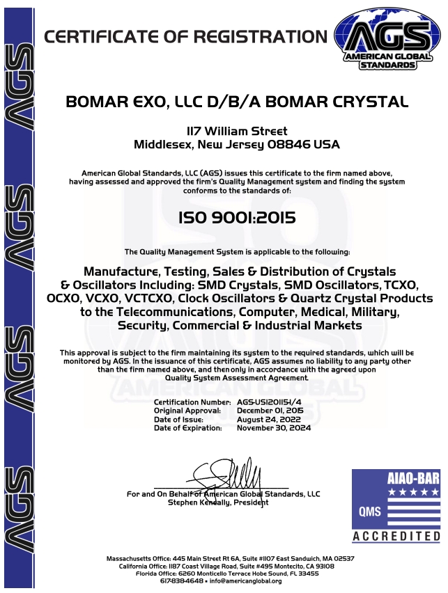 Bomar Crystal已升級至 ISO 9001:2015認證