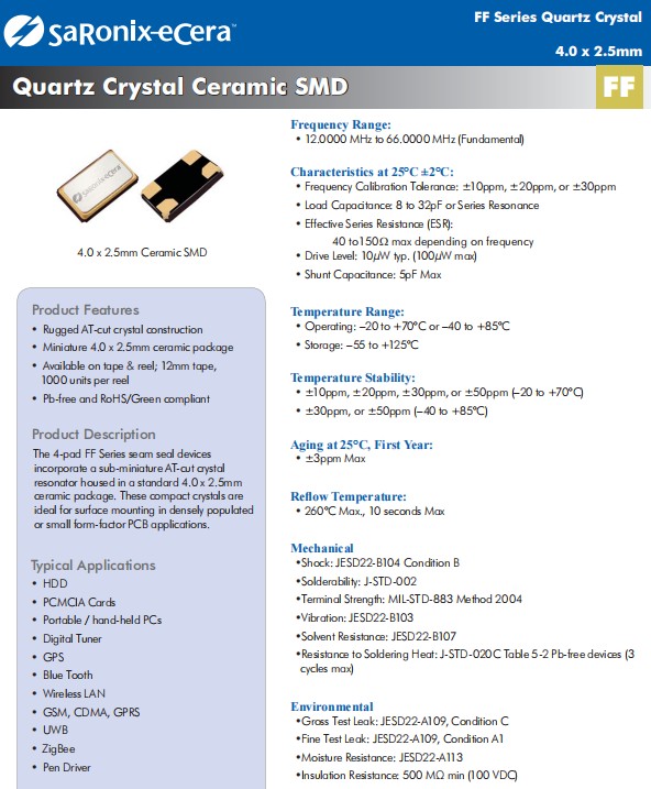 Diodes晶振,FF四腳貼片晶振,4025mm晶振,平板電腦晶振,FF系列接縫密封裝置適用于封裝在標準4.0x2.5mm四腳貼片晶振,外殼中的亞微型AT-cut晶體諧振器 陶瓷封裝。這些緊湊型晶體非常適合在密集彈出或小尺寸PCB應用中進行表面貼裝。堅固的AT切割水晶結構 微型4.0x2.5mm毫米陶瓷封裝 提供磁帶和卷軸;12毫米膠帶,每卷1000個,無鉛且符合RoHS/Green標準 。典型應用:硬盤驅動器 PCMCIA卡 便攜式/手持電腦 數字調諧器 全球定位系統 碧藍之牙 無線局域網 GSM、CDMA、GPRS 超寬帶 ZigBee 筆驅動程序.