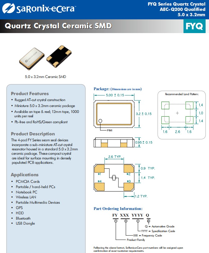 Diodes百利通亞陶晶振,FYQ環(huán)保晶振,FY1000009無源晶振,FY2400053小體積晶振,多媒體設(shè)備晶振